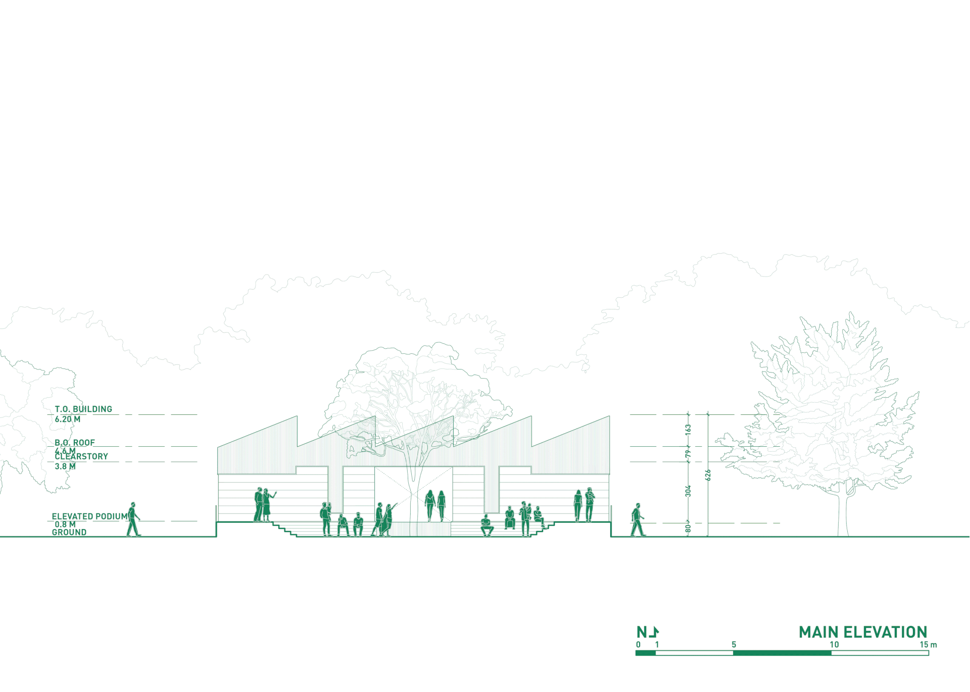 A key feature of our design is its expandability. As the population of Kodidoddi and other villages grows, or as their needs change, additional modules can be seamlessly integrated into the existing structure. This phased expansion can occur without disrupting daily operations, ensuring continuous service to the community. The interconnected intermittent roof system supports this scalability, while maintaining a normative roof system for each module, providing a cohesive aesthetic and functional unity across the entire structure as the community center expands & grows.